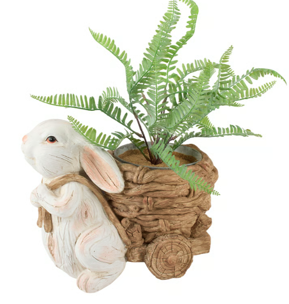 A planter displaying a cute Easter inspired design of a bunny pulling a basket on wooden wheels. Easter bunny planter features painted and sculpted details to resemble an art piece carved from wood. Our Bunny Basket planter features opening in the basket to place potted plants or seasonal décor and is made for indoor or outdoor use. Greenery pictured not included. A rustic plant accessory with a variety of seasonal display options.