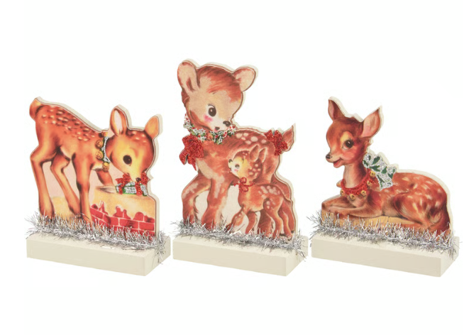 A set of three wooden stand ups displaying cutout designs of reindeer in a vintage art style with glitter and tinsel accents. Sides and back feature coordinating cream color. Our Christmas Deer stand up set can free-stand on any flat surface using attached wooden bases. Set is packaged together in a poly bag and tied with red ribbon. A vintage set of seasonal home accents with a variety of display options.