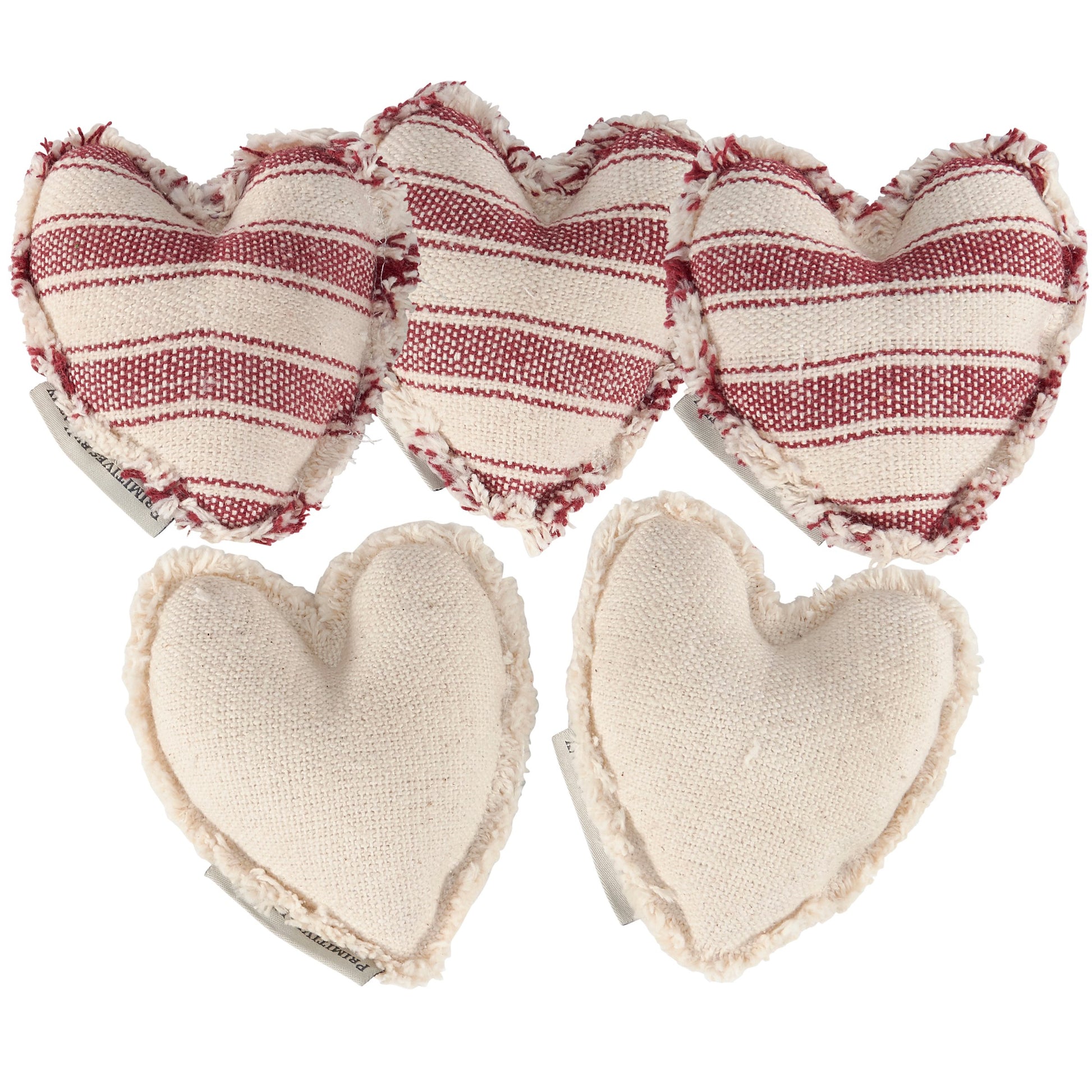 cotton fabric hearts f displaying a rustic inspired handmade style and love-themed sentiments. Decorative hearts with deep red stripe designs or two with sentiments that read "Love" and "XOXO." Our Love fabric heart is perfect for rustic Valentine's Day decorating and are easy to add to any seasonal display.