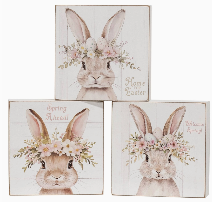 The adorable bunnies depicted on the assorted Welcome Spring Floral Crown Bunny Box Signs bring a sweet accent to shelf tabletop or wall decor. Made from wood the box signs are painted white with rustic distressed edges. The signs each measure 5" high by 5" wide by 1.5" deep and have an open back design for versatile hanging or freestanding display. Each sign depicts a detailed bunny wearing a pink white and green floral crown and 2 of the signs also feature decorated Easter eggs. One sign features text that reads "home for Easter one says "welcome spring and one says "spring